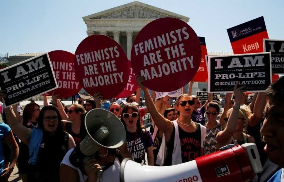 IMAGE: Pro-abortion rights protesters and anti-abortion protesters jostle with their signs as they demonstrate in the hopes of a ruling in their favor on decisions at the Supreme Court building in Washington, June 20, 2016. REUTERS/Jonathan Ernst