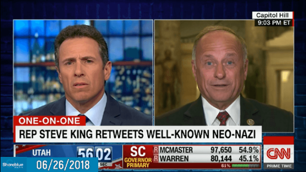 King has a long and ugly history of openly racist remarks and support for extremist policies. Last August, for example, King said immigrants brought to this country as young children should be turning their parents over to the government and asking “should have the law enforced against them.”