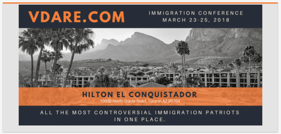 VDare has been promoting an upcoming “immigration conference” in March that would have featured “all the most controversial immigration patriots in one place.” The stated venue for the conference was the Hilton El Conquistador in Tucson, AZ, which is owned by HSL Properties.