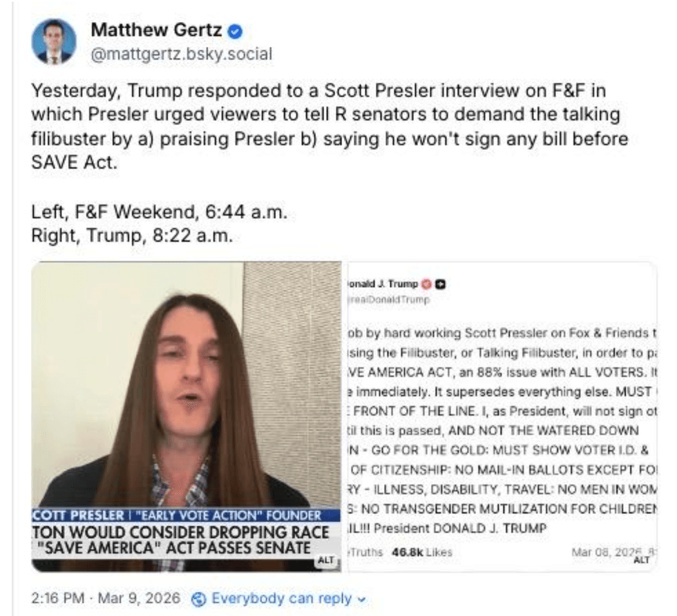 On March 8, the president declared on Truth Social that he had been so moved by MAGA activist Scott Presler’s comments about the SAVE Act on Fox & Friends that morning that he would sign no other legislation until it was passed.