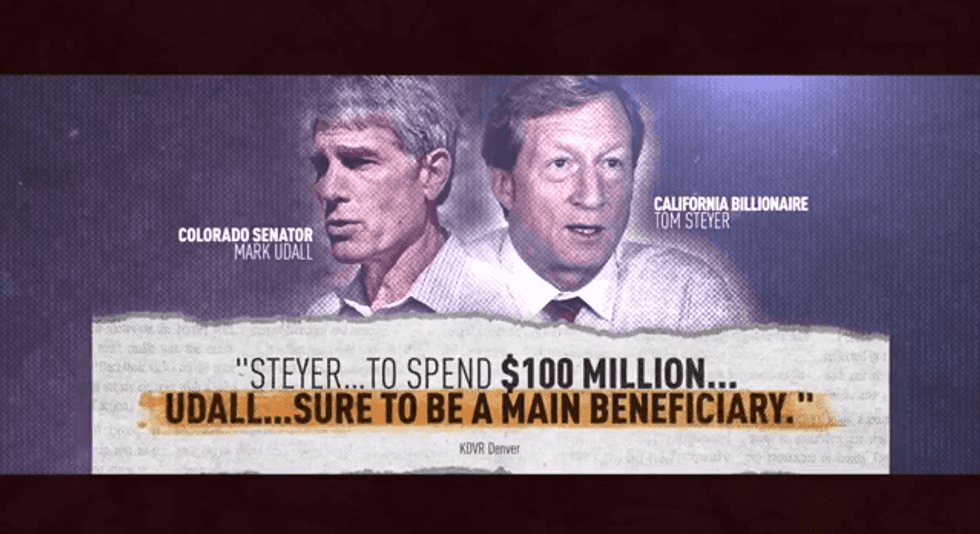 “California billionaire Tom Steyer is bankrolling Colorado senator Mark Udall’s campaign. Steyer even hosted Udall for a fundraiser at his San Francisco mansion,” the ad’s narrator says. “Now Mark Udall is helping Tom Steyer kill the Keystone pipeline.”