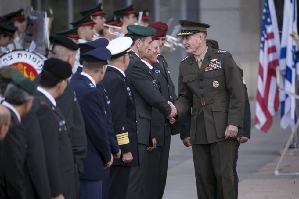 U.S. Chairman of the Joint Chiefs of Staff Joseph Dunford (R) shakes hands with Israeli army officers during a welcoming ceremony for him in Tel Aviv, Israel, October 18, 2015. REUTERS/Baz Ratner
