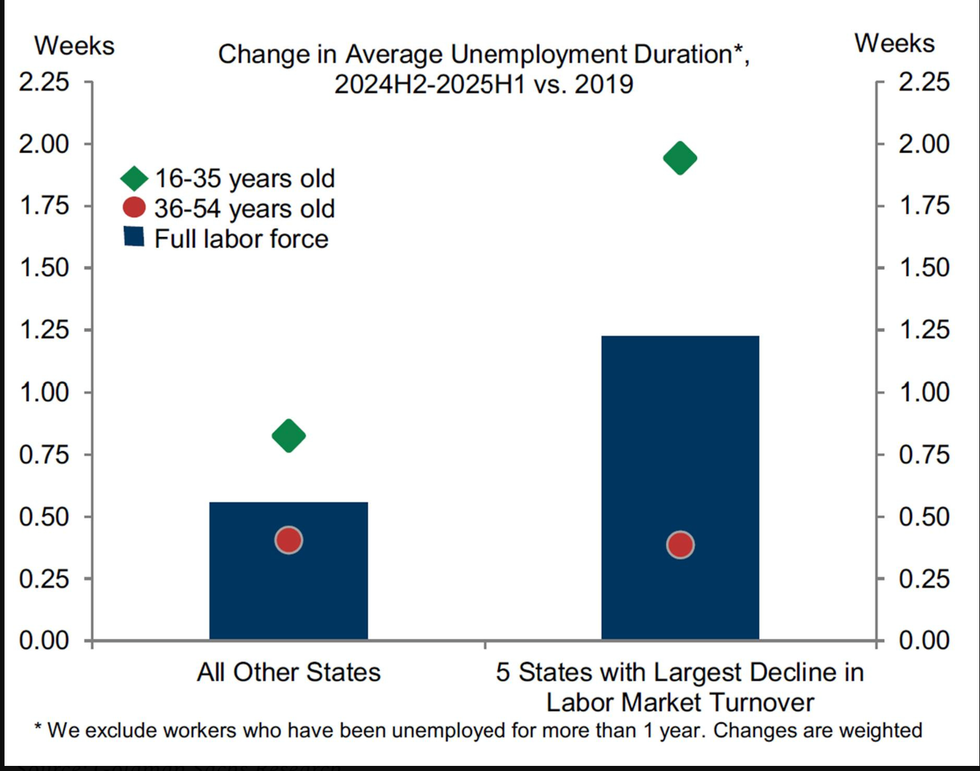 Consider, for example, the figure below from GS Research. It shows that if you take the five states with the biggest decline in turnover (hires, fires, quits), you find a steep increase in jobless durations, especially for younger workers. Other data shows this effect to be particular tough for young college grads. (AI? It may be in the mix—I’d be surprised if it wasn’t—but still hard to tell.)