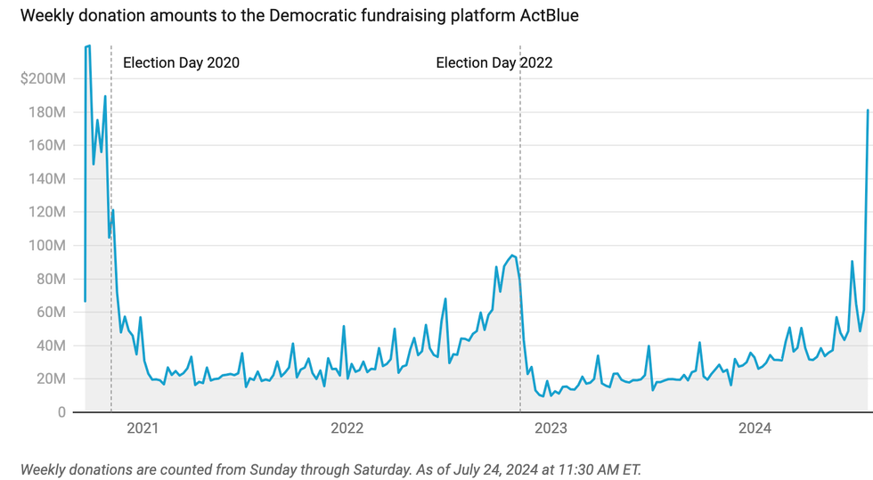 The latest surge in registrations comes as Harris and other Democratic candidates see a flood of donations. Since Harris entered the race, ActBlue has recorded $179 million in donations to Democratic candidates and causes. That's just part of a historic flood of over $250 million that poured in since Harris became the nominee-apparent.