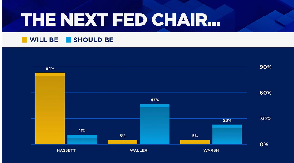 I wrote last week about Kevin Hassett, Trump’s likely pick as the next Federal Reserve chairman, whom I described as an “ideological DEI hire” who is intellectually and morally unqualified for the job. It turns out that I’m not alone in that assessment, although I may be using unusually blunt language. CNBC regularly surveys financial experts for their views on Fed-related matters. According to their latest survey, featured in the chart below, almost all their experts believe that Hassett will get the job, but almost none of them think he should.