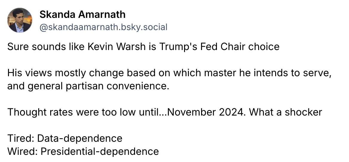 Independent economists who don’t feel the need to maintain good relations with the corridors of power are being quite forthright on the Warsh nomination. Here are a couple of reactions from my feed: