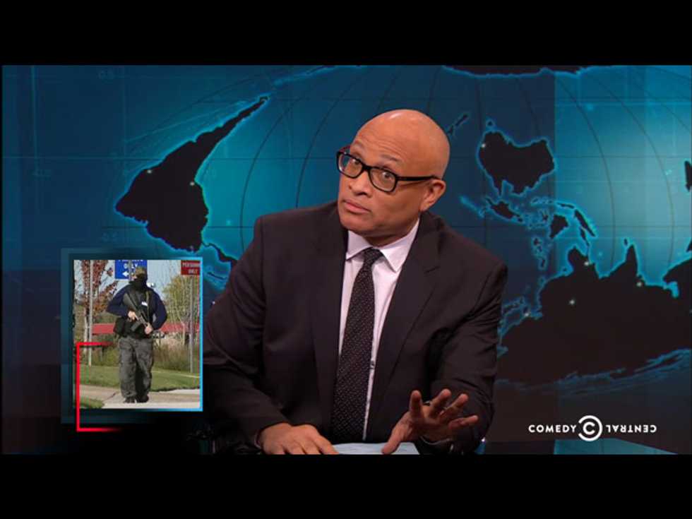 Larry Wilmore looked at the wave of anti-Muslim crimes and intimidation across the country — such as the crowd of armed white men gathering outside a mosque in Irving, Texas. “Okay, here’s my question: Why is it white people can be armed with guns and just roam around anywhere — and nothing happens? I’m not saying something should happen — I’m just saying it doesn’t.”