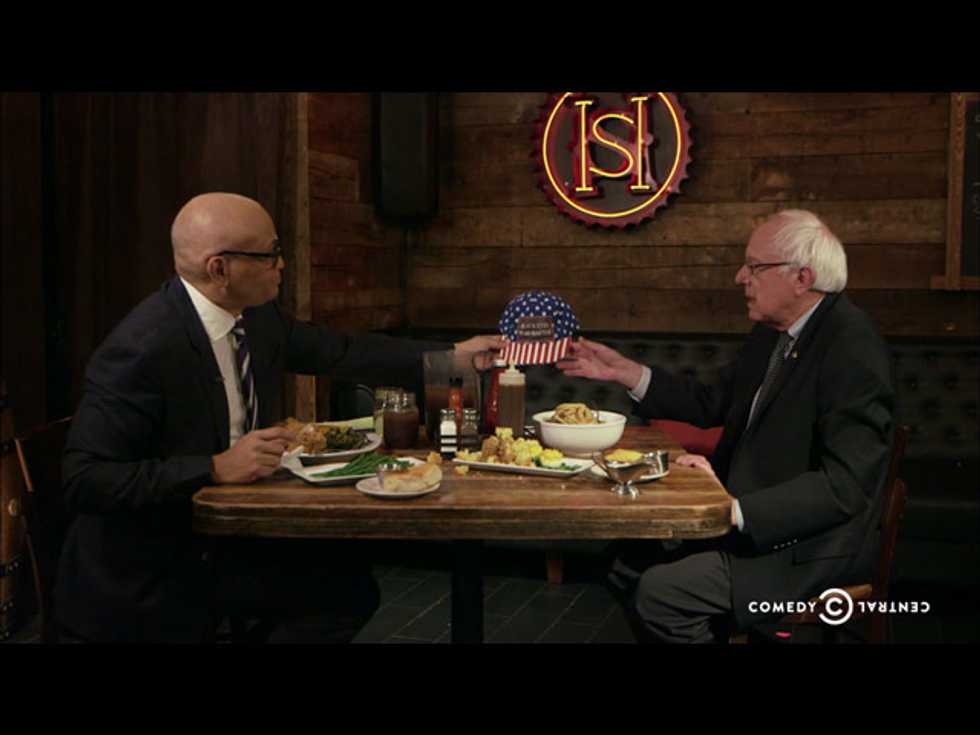 It was a busy night of interviews for the late night shows. First up, Larry Wilmore took Bernie Sanders for a soul food dinner — and offered him an idea for a new campaign hat, to compete against Donald Trump.