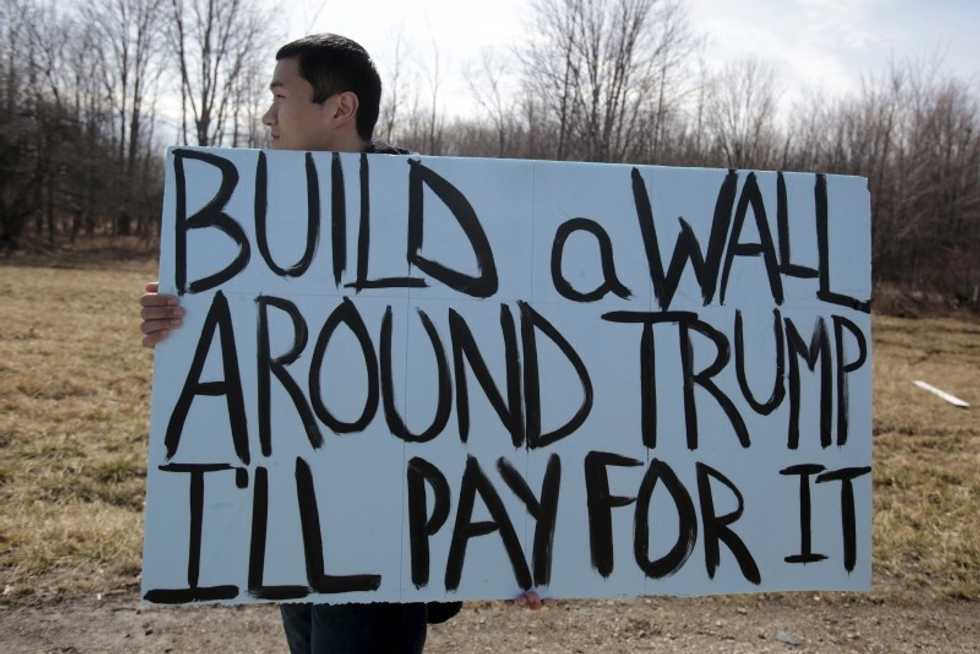 Photo: An anti-Trump protester holds his protest sign outside a rally for Republican U.S. presidential candidate Donald Trump in Cleveland, Ohio, March 12, 2016. REUTERS/Rebecca Cook