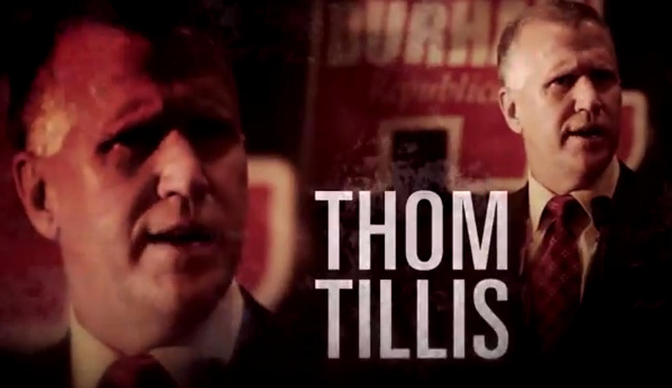 On the dark money side, three conservative groups, led by Americans for Prosperity, the Koch brothers’ flagship dark money group, have spent almost $1.4 million on ads criticizing Hagan. One ad portrays her as being best pals with President Obama. “Tell Sen. Hagan to stop thinking about politics and start thinking about people,” says another.