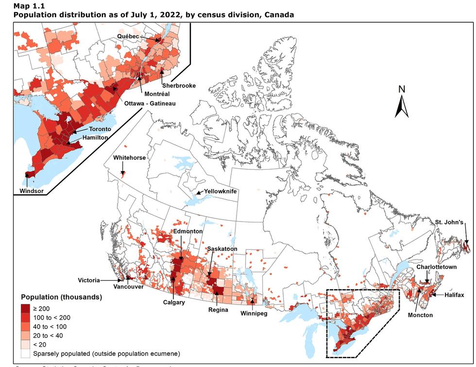 It was a brave stand to take. Canada sits right next to the United States, whose economy is a dozen times larger. Moreover, as the map below shows, Canada’s population lies almost entirely within a narrow band on top of the U.S. Back when I was writing a lot about economic geography, I used to joke that Canada was closer to the United States than it was to itself. Nature wants Canada and the United States to be closely intertwined. And for this reason Canada is arguably more exposed to the consequences of Trumpian wrath than any other nation.