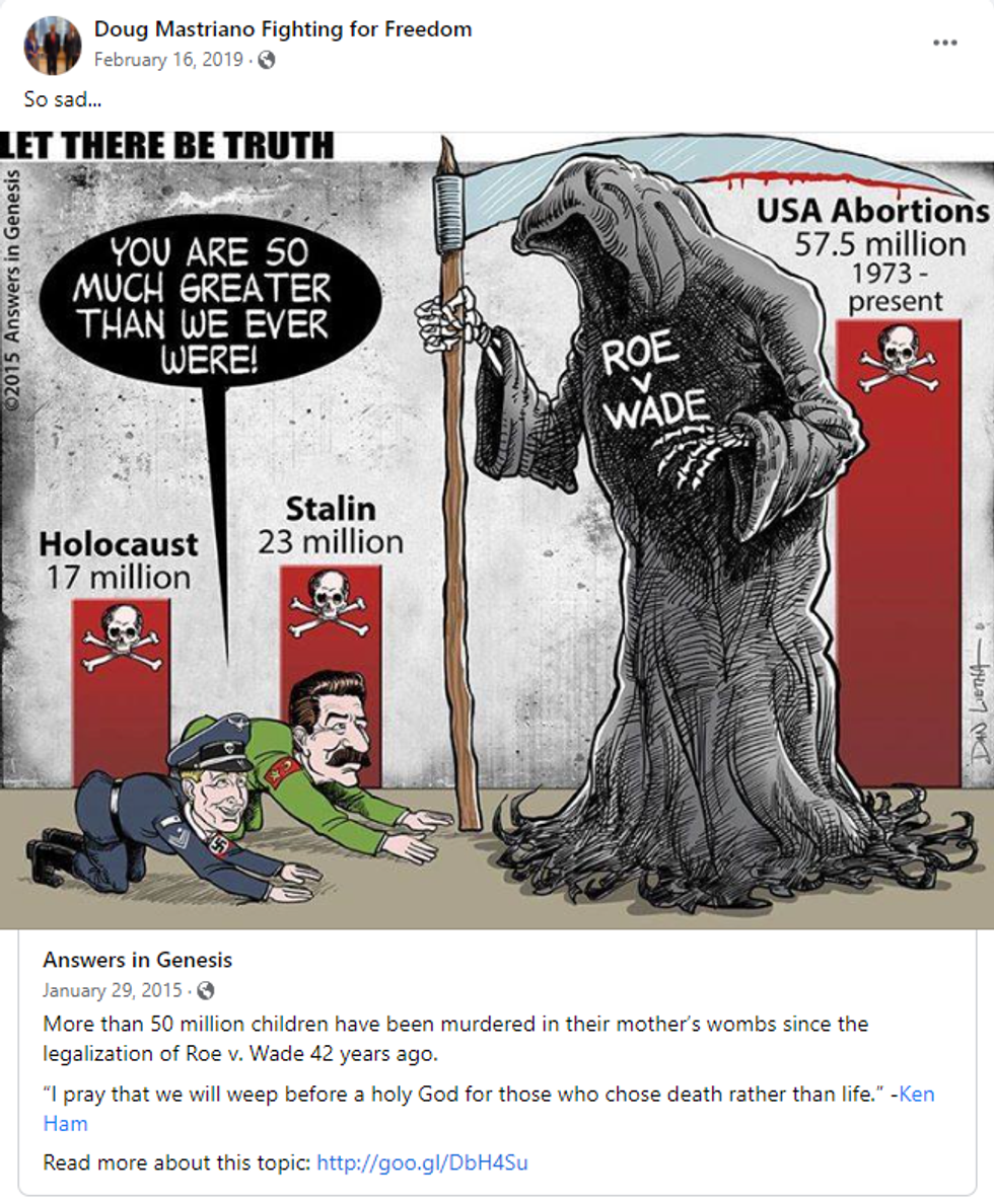 On February 16, 2019, Mastriano shared a cartoon from the organization Answers in Genesis featuring a Nazi and Joseph Stalin bowing down to a Grim Reaper labeled Roe v. Wade. A dialogue bubble from the Nazi and Stalin says: “You are so much greater than we ever were!” The cartoon includes death figures of 17 million for the Holocaust; 23 million for Stalin; and 57.5 million for “USA Abortions.” Mastriano commented: “So sad.”