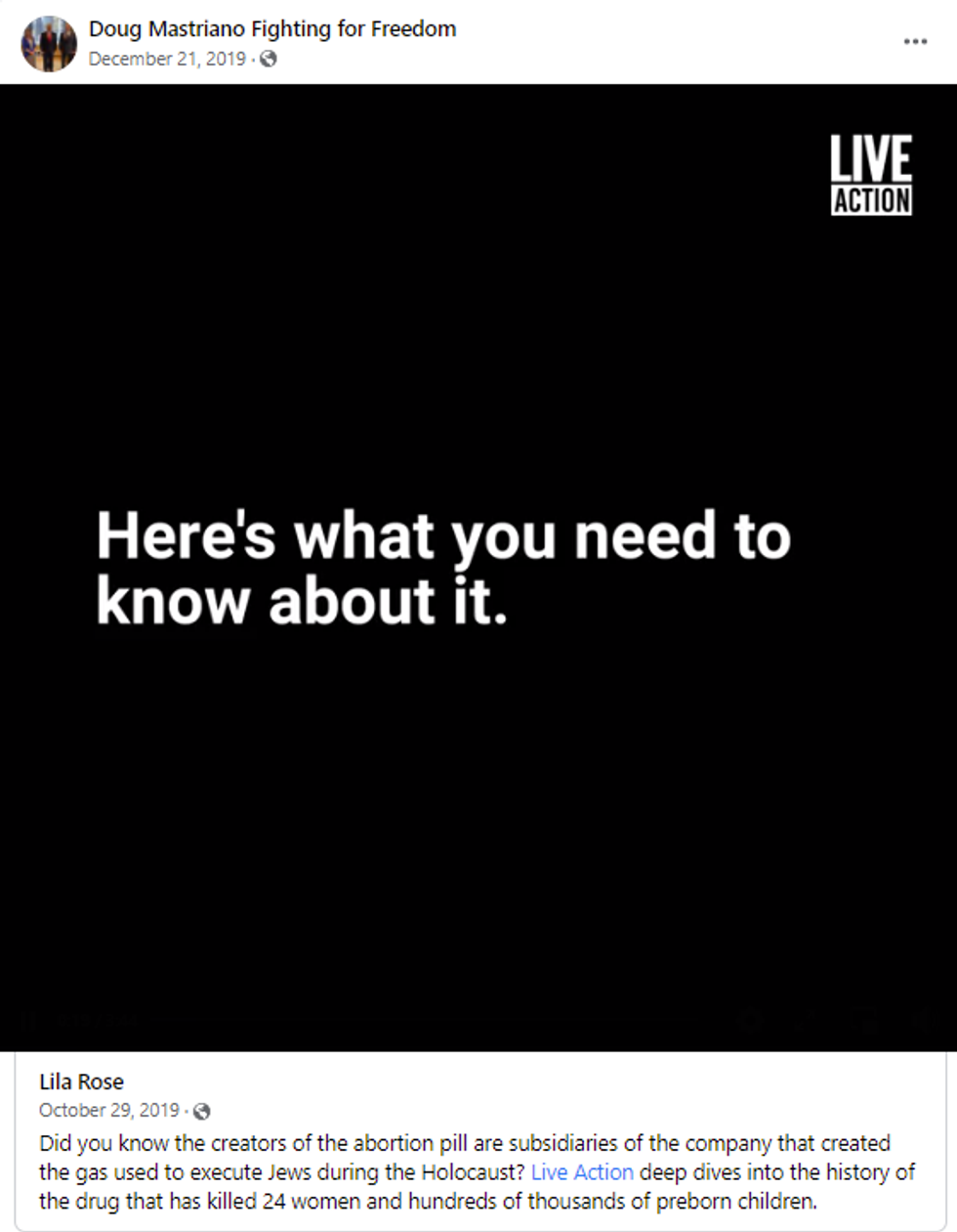 On December 21, 2019, he shared a Facebook video from Lila Rose — the leader of anti-abortion group Live Action — that links the abortion pill mifepristone to the gas used to murder Jews in the Holocaust.