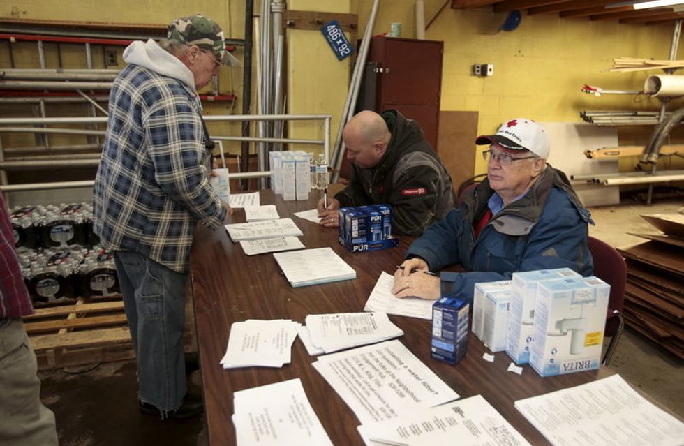 Photo: A Flint resident (L) picks up a replacement water filter at a fire station in Flint, Michigan January 13, 2016. REUTERS/Rebecca Cook