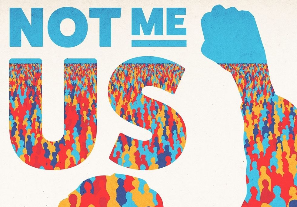 The Sanders campaign has a new set of posters spreading across the internet. Consisting of an outline of Sanders with his first raised in the air against an off-white background, his shape is filled in with a mosaic of blue, purple, yellow, and red silhouettes. The message is simple: “Not me, Us.”
