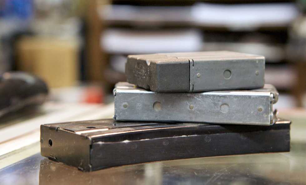 IMAGE: AR-15 type rifle magazines, (top to bottom) 10-round, 20-round and 30-round, are displayed at Chris’ Indoor Shooting Range in Guilford, CT. REUTERS/ Michelle McLoughlin/File Photo