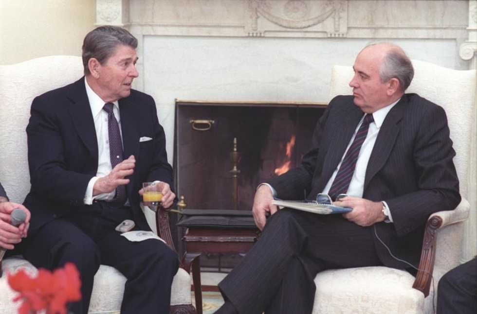 Photo: President Ronald Reagan and Soviet General Secretary Gorbachev having their first meeting in the Oval Office at the White House, December 8, 1987. (Via Wikicommons)
