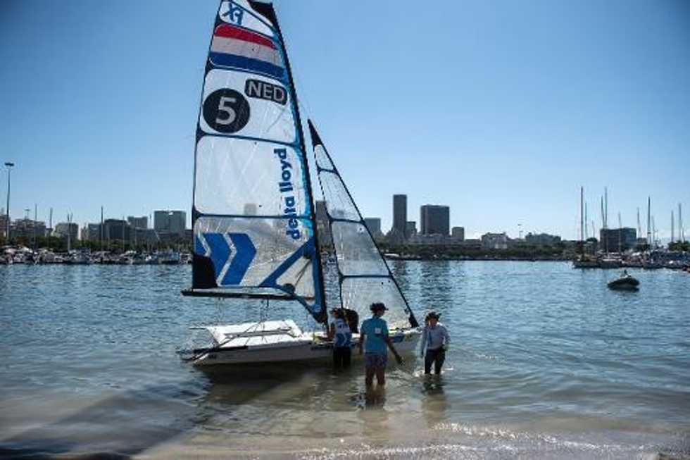 Mathew Belcher, Australia’s London Olympic champion in the 470 class, had to tear plastic bags off his craft after his training on Tuesday.