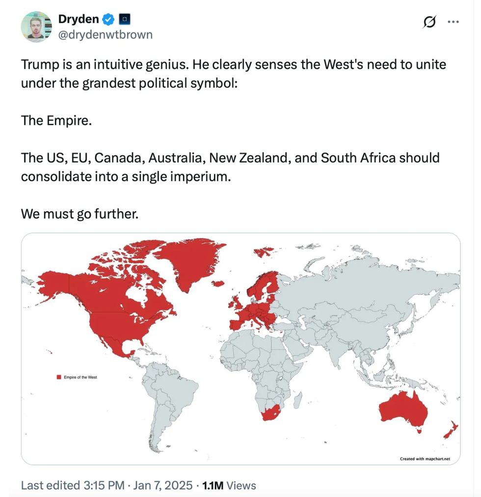 Brown was moved to advertise his own white nation fantasies the same day Junior landed in Greenland, in a giddy tweet that included a map (see below) of a new American empire encompassing all the white-led nations on the planet.