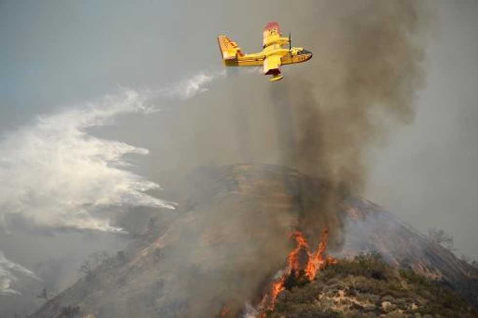 An aircraft drops water on the Colby Fire, January 16, 2014 in Azusa, California (AFP Photo/Robyn Beck)