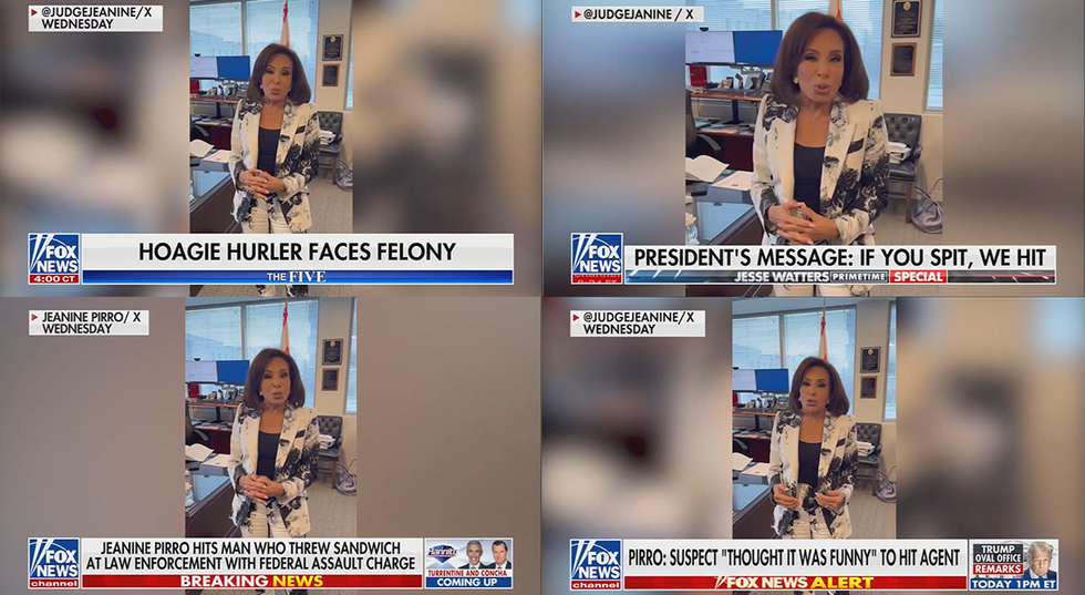 U.S. Attorney Jeanine Pirro’s former colleagues at Fox News cheered her August 13 announcement that she was charging a D.C. resident who threw a sandwich at a federal law enforcement officer with felony assault. The network’s hosts claimed that thanks to the “new sheriff in town,” the man “will be held accountable in a court of law.”