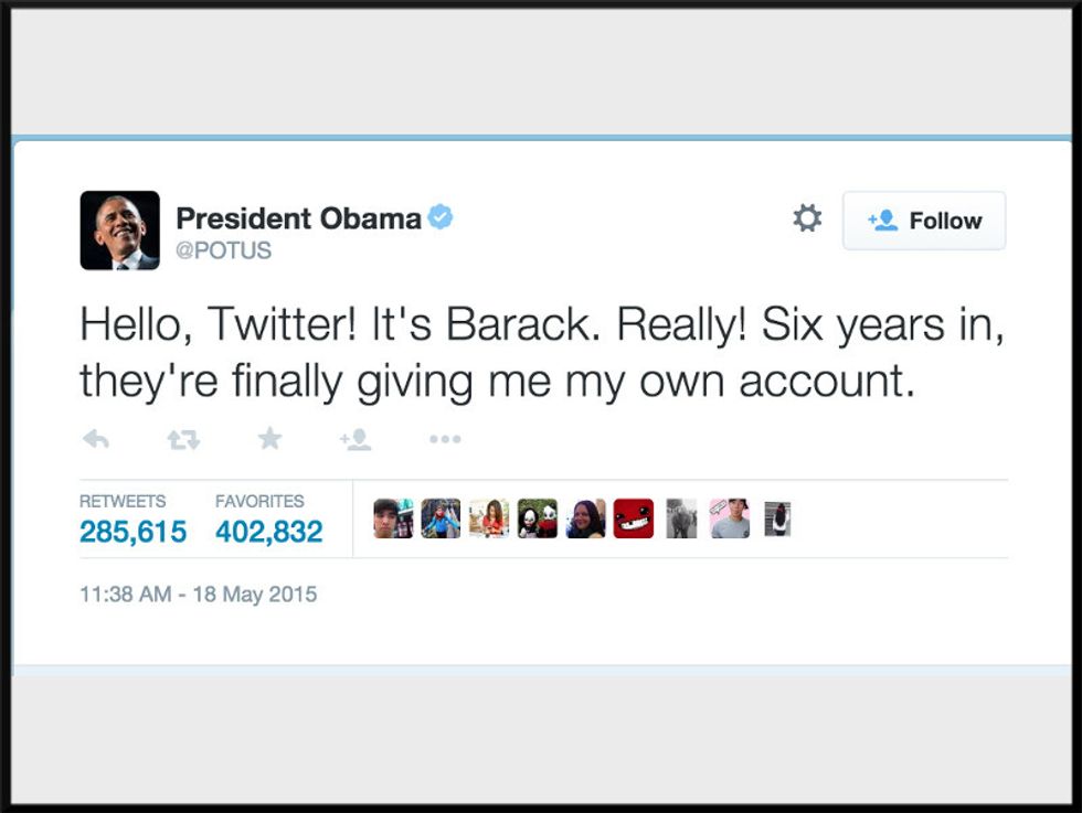 @POTUS — not to be confused with @BarackObama, which is controlled by the group Organizing for Action — is the actual Twitter handle of the president.