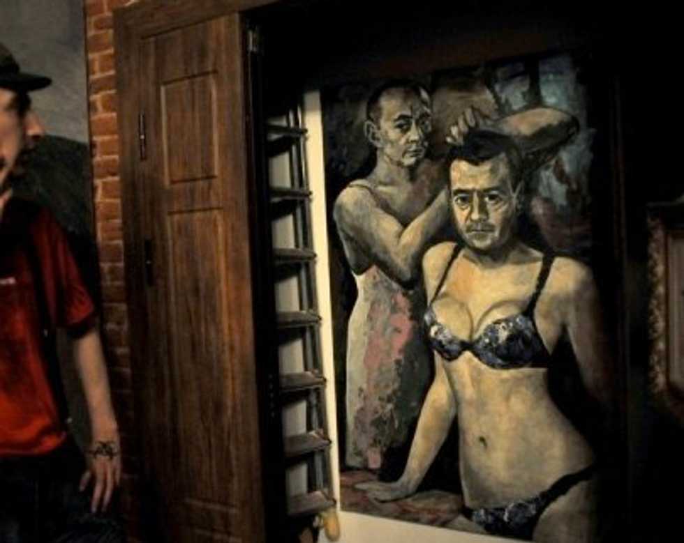 Police on Tuesday raided an exhibition in the northwestern city of Saint Petersburg, which next week hosts the G20 summit, and confiscated works including a painting of Putin in a strappy nightie and Medvedev in a bra and skimpy knickers.