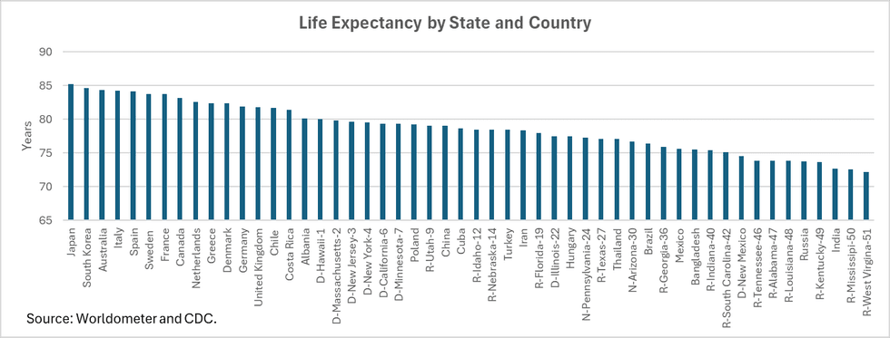 The first thing I should point out is that the international data are not entirely comparable to the data on life expectancies in U.S. states. The international data are taken from the Worldometer, which in turn comes from the United Nations. The state data are from the Centers for Disease Control (CDC). The U.S. average is about two years higher in the Worldometer data than in the average in the CDC data, so it would be appropriate to add around two years to the state data to make an apples-to-apples comparison.