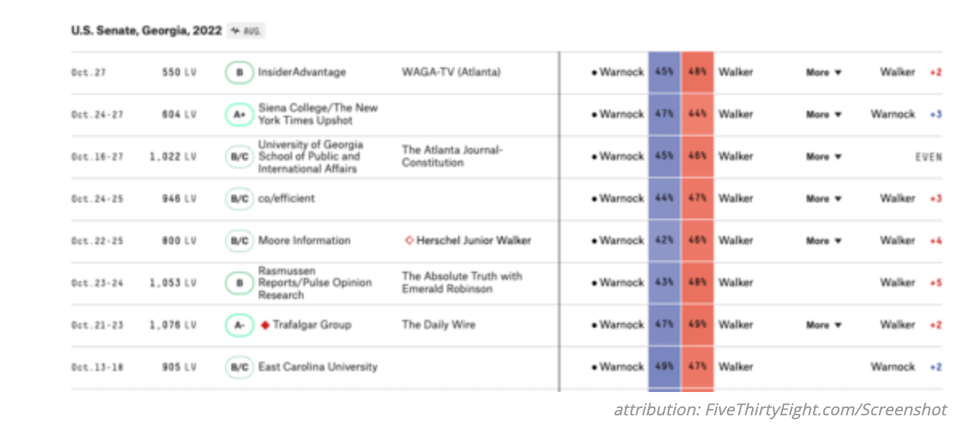 Take Georgia, for instance—until about October 21 or 22, Democratic incumbent Sen. Raphael Warnock had been holding a pretty steady three to four-point lead during October over his GOP rival Herschel Walker in FiveThirtyEight's aggregate. Then the gap suddenly narrowed to about one point in the final week of October, Warnock 46.7 percent - Walker 45.4 percent.