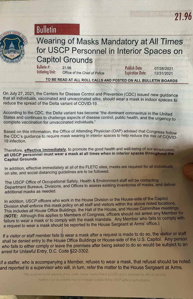 The barrage of complaints came after the Capitol Police issued a memo citing the new Centers for Disease Control and Prevention guidance urging vaccinated and unvaccinated people to wear masks in public indoor settings to curb the spread of the Delta coronavirus variant, and a decision by Congress' attending physician to require mask use in the federal building.