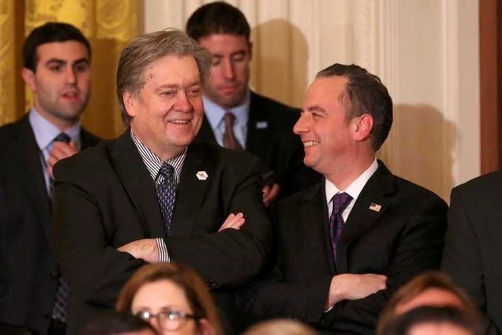 IMAGE: White House Chief Strategist Steve Bannon (L) and White House Chief of Staff Reince Priebus (R) watch as U.S. President Donald Trump announces his nominee for the empty associate justice seat at the U.S. Supreme Court, at the White House in Washington, D.C., U.S. January 31, 2017. REUTERS/Carlos Barria
