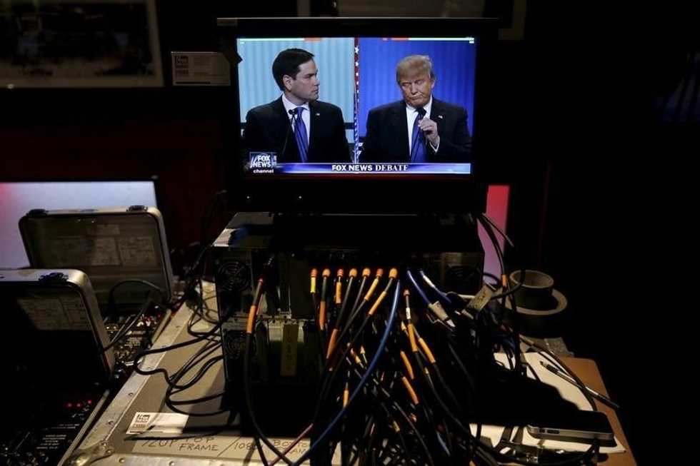 Photo: Republican U.S. presidential candidates Marco Rubio (L) and Donald Trump are seen on a television monitor at the media center of the Republican presidential debate site in Detroit, Michigan, March 3, 2016. REUTERS/Carlos Barria