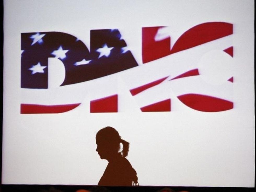 A woman is silhouetted against a projected image of the Democratic National Committee during its Rules and Bylaws Committee meeting in Washington May 31, 2008. REUTERS/Jason Reed