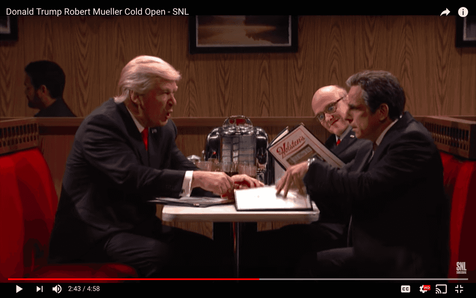 But then the door jangles open one last time for an ominous figure noticed only by Trump — Robert Mueller (Robert DeNiro), the special counsel whose scowling silence says it all.