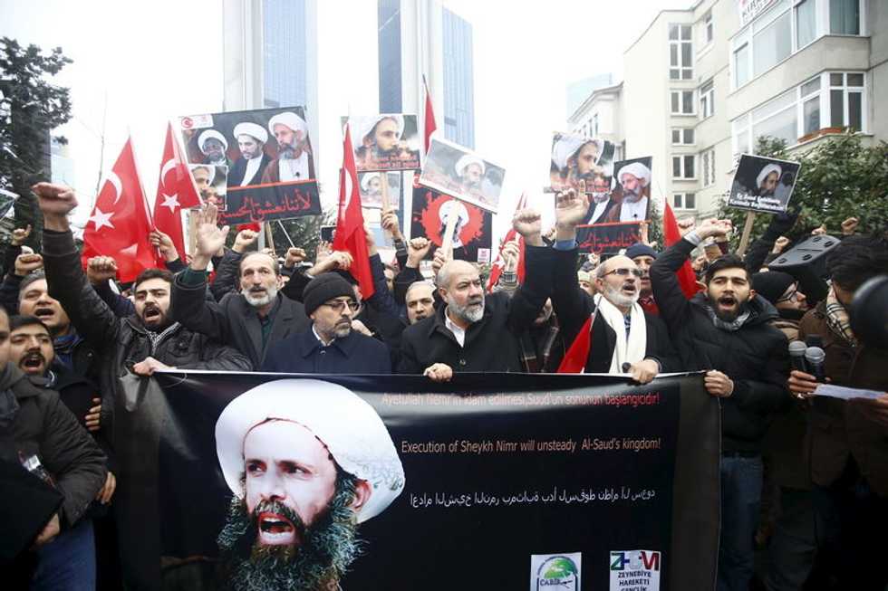 Shi’ite protesters carry posters of Sheikh Nimr al-Nimr during a demonstration in front of Saudi Arabia’s Consulate in Istanbul, Turkey, January 3, 2016. REUTERS/Osman Orsal