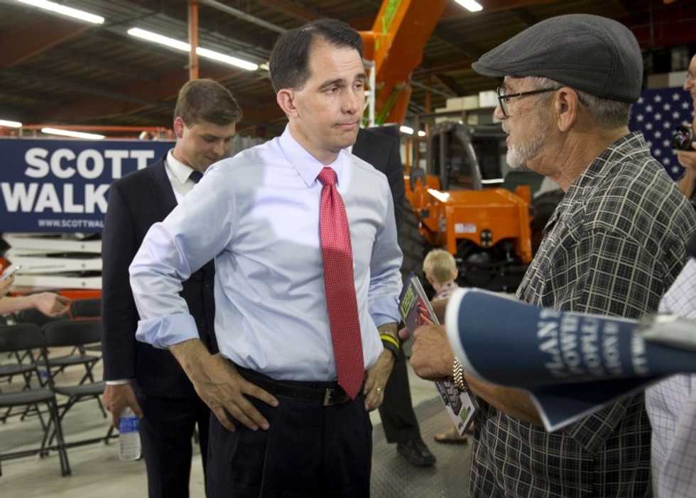 Photo: Republican presidential candidate Wisconsin Gov. Scott Walker (C) listens to Steve Small following a town hall meeting at the Xtreme Manufacturing warehouse in Las Vegas, Nevada on September 14, 2015. REUTERS/Las VegasSun/Steve Marcus
