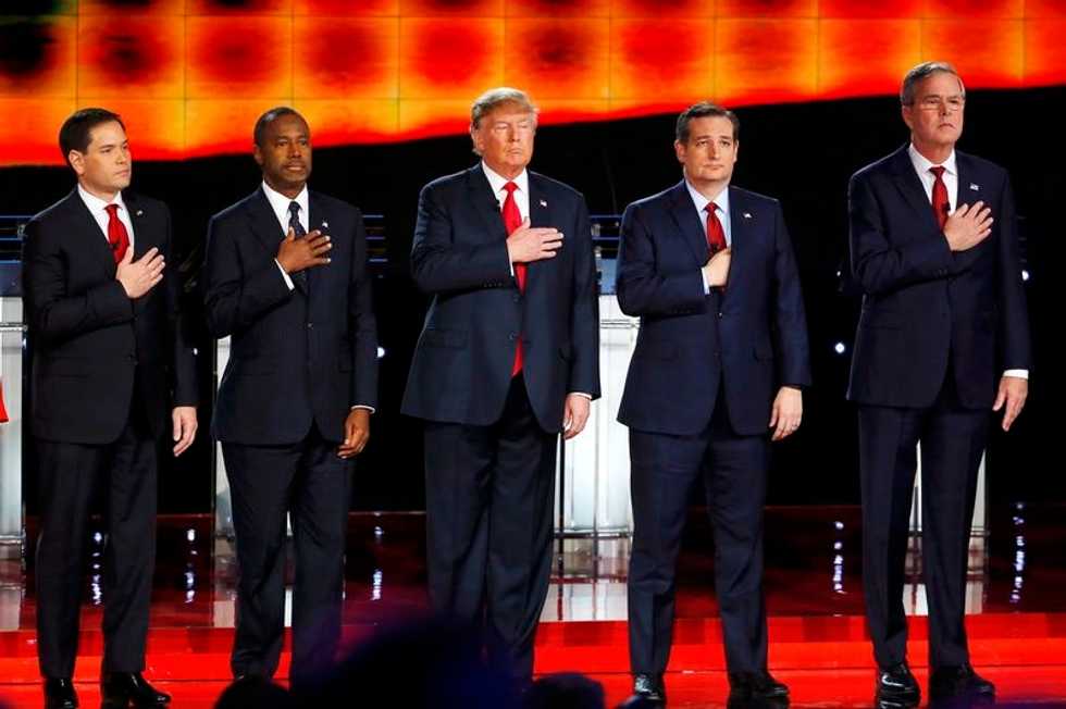 Photo: Are Republicans willing to deal with everything the presidency entails? Republican U.S. presidential candidates (L-R) Senator Marco Rubio, Dr. Ben Carson, businessman Donald Trump, Senator Ted Cruz and former Governor Jeb Bush hold their hands over their hearts for the singing of the U.S. national anthem before the start of the Republican presidential debate in Las Vegas, Nevada December 15, 2015. REUTERS/Mike Blake