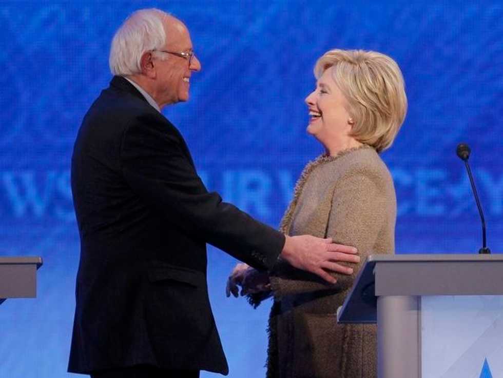 Photo: Democratic U.S. presidential candidates Senator Bernie Sanders and former Secretary of State Hillary Clinton talk during a commercial break at the Democratic presidential candidates debate at St. Anselm College in Manchester, New Hampshire December 19, 2015. REUTERS/Brian Snyder