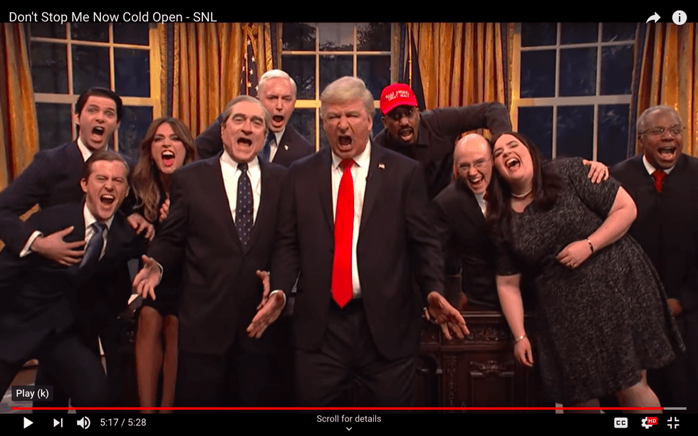 Joined by the rest of the cast’s White House regulars in this ominous musicale, the president warns that he’s “on cruise control to a second term.” But before the end, Robert Mueller (Robert DeNiro) steps in with “something important to tell America,” but Baldwin shouts him down: “No collusion! No obstruction!”