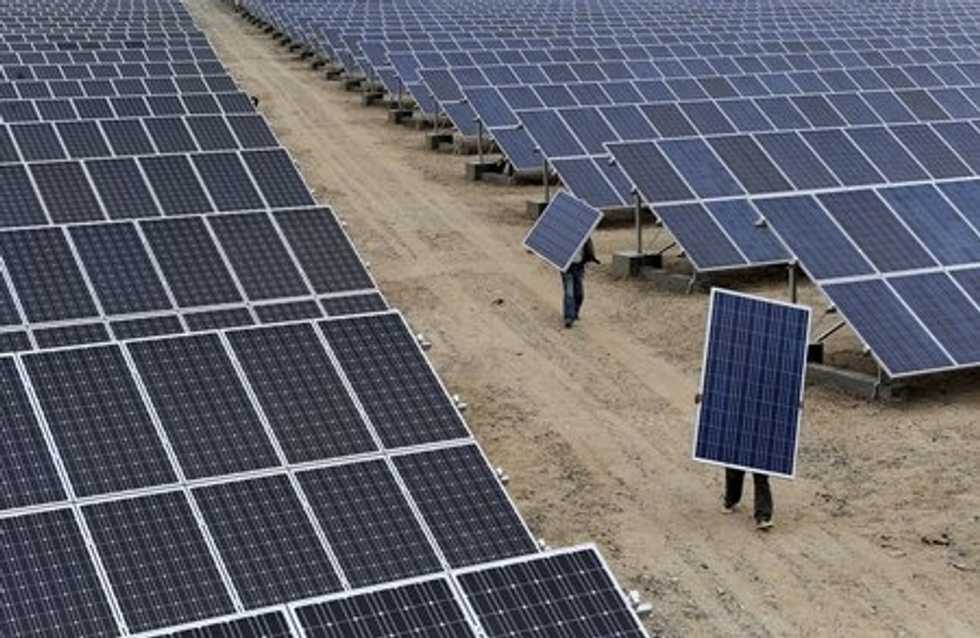 PHOTO: Employees carry solar panels at a solar power plant in Aksu, Xinjiang Uyghur Autonomous Region, in this file photo. REUTERS/Stringer/Files