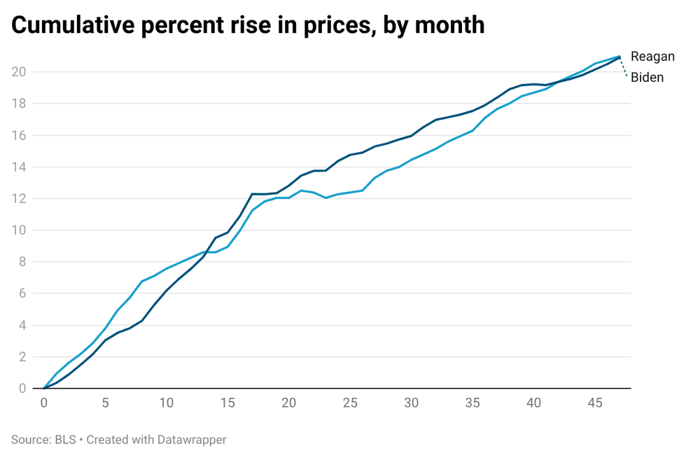 The two presidents’ track records on prices were almost identical. Yet Reagan ran a triumphant reelection campaign on the theme that it was Morning in America, while the Biden economy was vilified. What was that about?