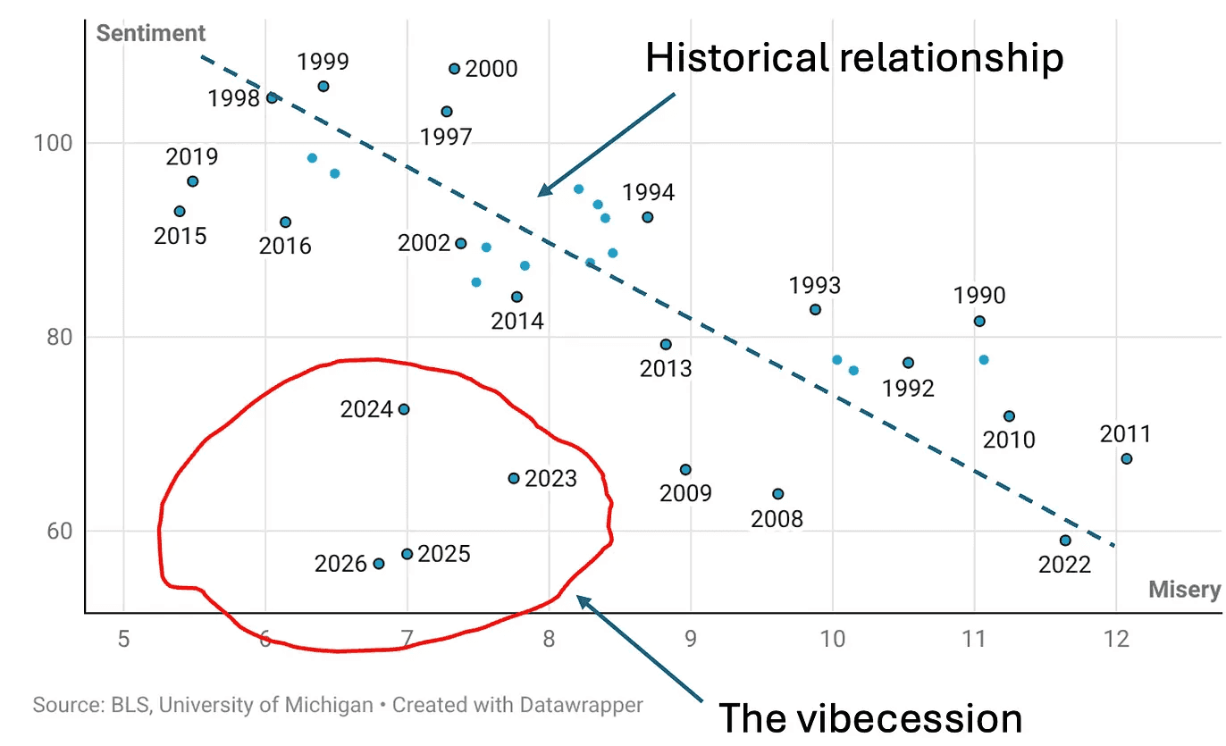Start with the puzzle: Why are Americans so down on an economy that, while not the greatest, isn’t terrible by the usual measures? This isn’t a new question: Kyla Scanlon coined the term “vibecession” in 2022 for a situation in which people feel bad about an economy that doesn’t look that bad by the numbers. But the puzzle has intensified over time, both because the bad feelings have gotten worse and because the vibecession has been so persistent.