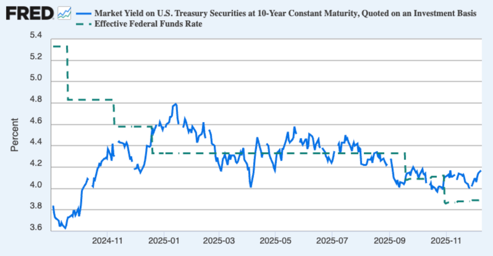 And long-term rates, which matter a lot more than short-term rates, especially for housing, mostly reflect market expectations of Fed policy over the next few years, not the next few months. As a result, long-term rates and short-term rates can diverge. They can even move in opposite directions. The Fed began its current cycle of rate-cutting in September 2024. Since then the fed funds rate has come down significantly but the benchmark 10-year interest rate has gone up from a low of 3.6 percent to the current level of just under 4.2 percent: