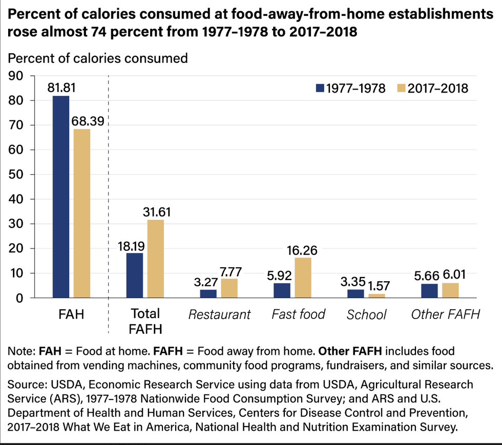 Unfortunately, the fact boxes miss the fastest growing component of U.S. food consumption: Restaurant meals, which are significantly less healthy than home-cooked meals. Over the past half century, restaurants nearly doubled their share of households’ “grocery and restaurant” spend (it would be higher now than the 2017-18 date in the chart below) and now account for fully a third of annual caloric intake, according to a 2024 survey by the U.S. Agriculture Department’s Economic Research Service.