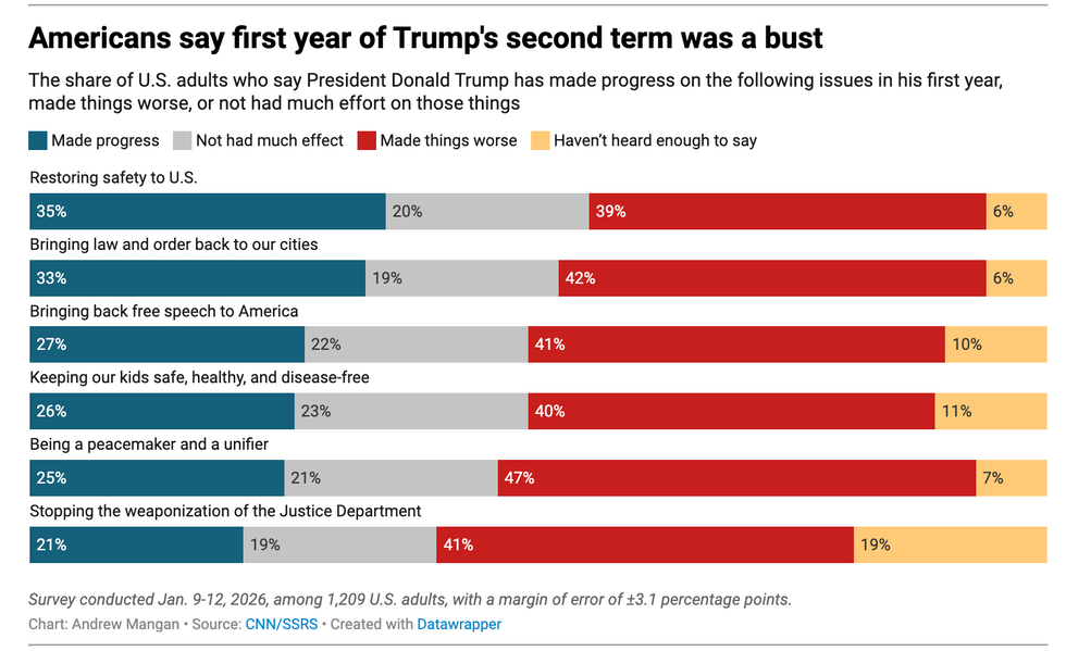 CNN/SSRS also polled Americans on whether they believe Trump has made progress on or exacerbated the issues he pledged to tackle in his dark inaugural address. The results there were also damning, with a plurality saying Trump made things worse on every single issue CNN surveyed.