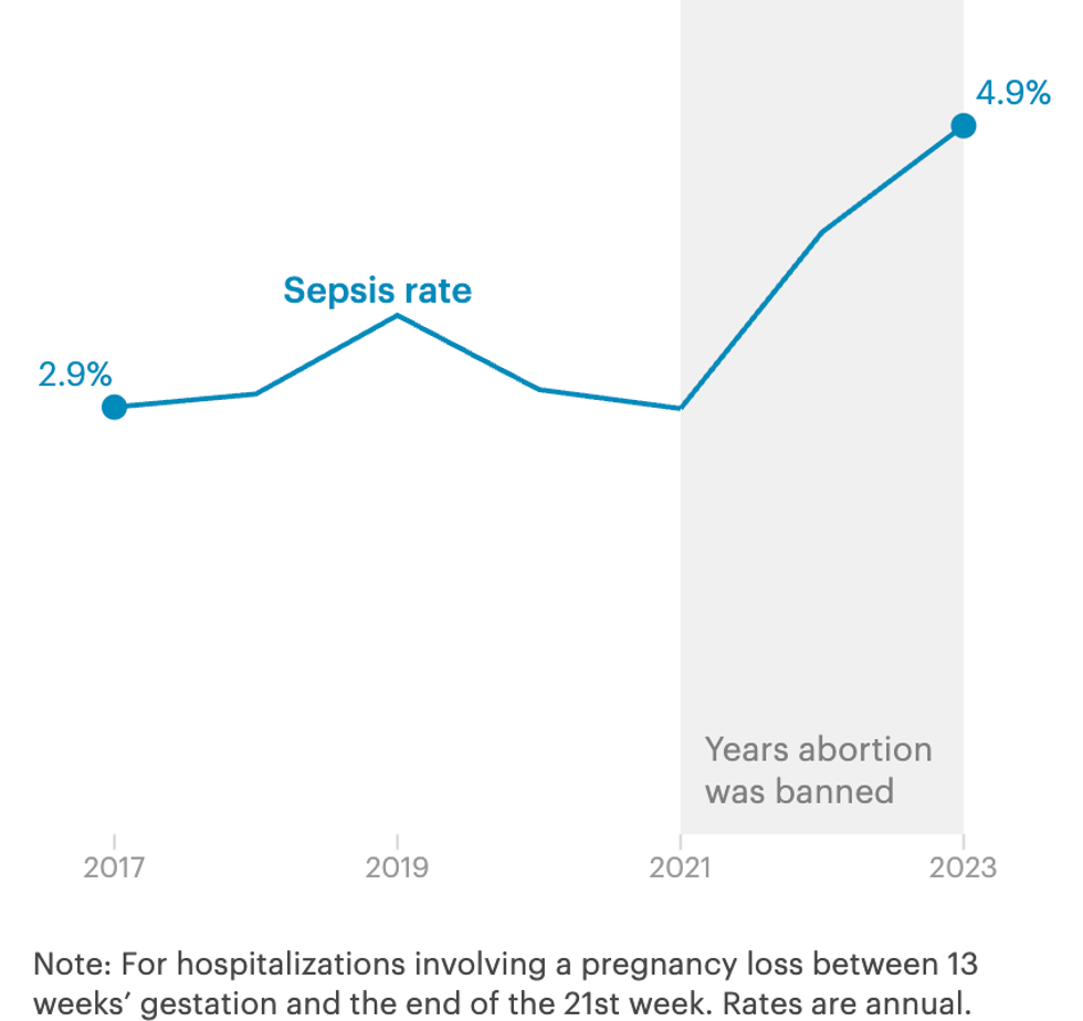 When abortion was legal in Texas, the rate of sepsis for women hospitalized during second-trimester pregnancy loss was relatively steady. Then the state’s first abortion ban went into effect and the rate of sepsis spiked.