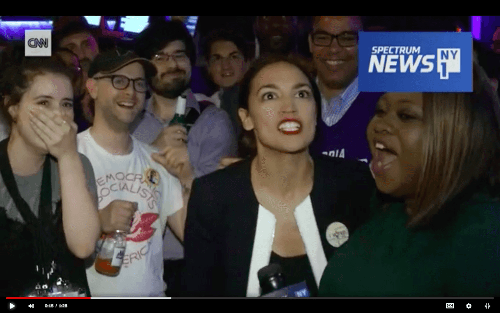 IMAGE: Primary challenger Alexandria Ocasio-Cortez at the moment of victory as she defeated incumbent Rep. Joe Crowley (D-NY), a top House Democratic leader, on June 26.