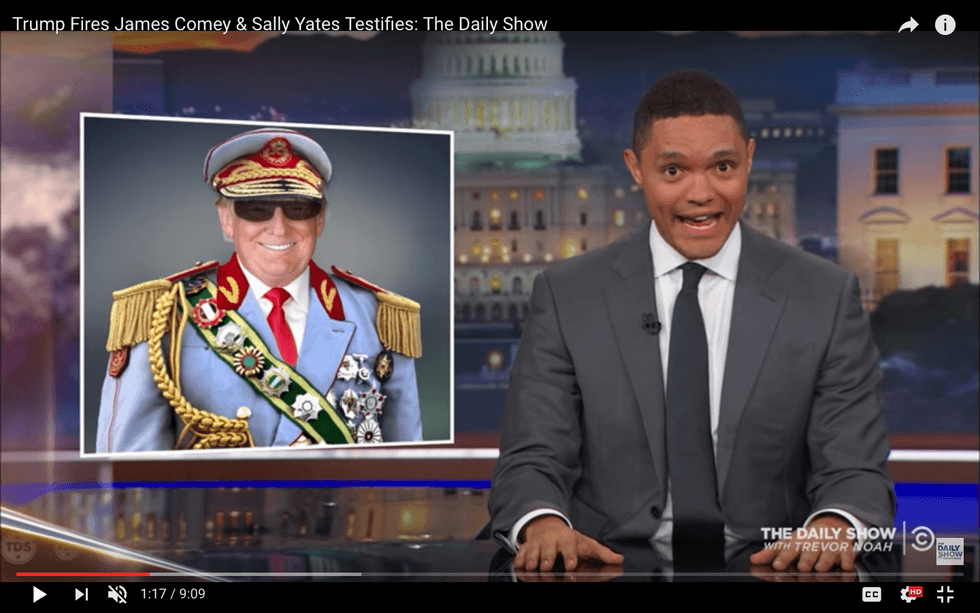 It was a blatantly authoritarian maneuver, topped with a wholly implausible gas-lighting justification. And the Daily Show host often notes Trump’s growing resemblance to the African dictators he has long observed on his home continent — a resemblance that, in the wake of the firing of James Comey is even more distinct. The preposterous pretext proffered by the White House for dismissing the overseer of the Russia investigation is “the most gangster excuse” he’s ever heard.