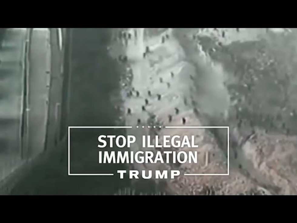 Trump’s new spot boasts, among various maniacal campaign vows, that the tycoon will “stop illegal immigration by building a wall on our Southern border — that Mexico will pay for,” as video is shown of a large crowd of people rushing a border fence.