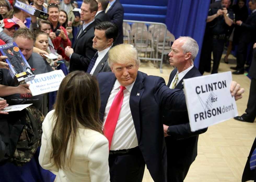 Photo: U.S. Republican presidential candidate Donald Trump holds up a sign given to him by a supporter at the end of a campaign rally in Council Bluffs, Iowa, January 31, 2016. REUTERS/Scott Morgan